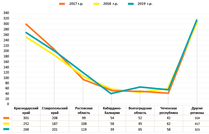 В таблице приведены данные по чистокровному поголовью, рожденному в шести разных регионах Российской Федерации в 2017, 2018 и 2019 годах. На основании этих данных построены соответствующие графики, которые коррелируют с распределением производственных ресурсов и отражают подвижки, происходившие на местах в обозначенный период времени. В каждом из выделенных регионов РФ как минимум дважды рождалось больше пятидесяти чистокровных жеребят в год, и этим они отличаются от других краев, областей и республик нашей страны. Общая масса поголовья, рожденного в этих шести регионах, составила примерно 70% от всего зарегистрированного российского молодняка 2019 г.р.
