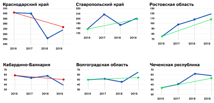 Путем сравнения усредненных показателей 2018-19 годов с данными предыдущего 2017 года можно определить в каком направлении развивается ситуация в шести перечисленных регионах. Например, уровень воспроизводства в Краснодарском крае в среднем снизился на 13%, в то время как количество поголовья, рожденного в Ростовской области, в среднем увеличилось на 18%.